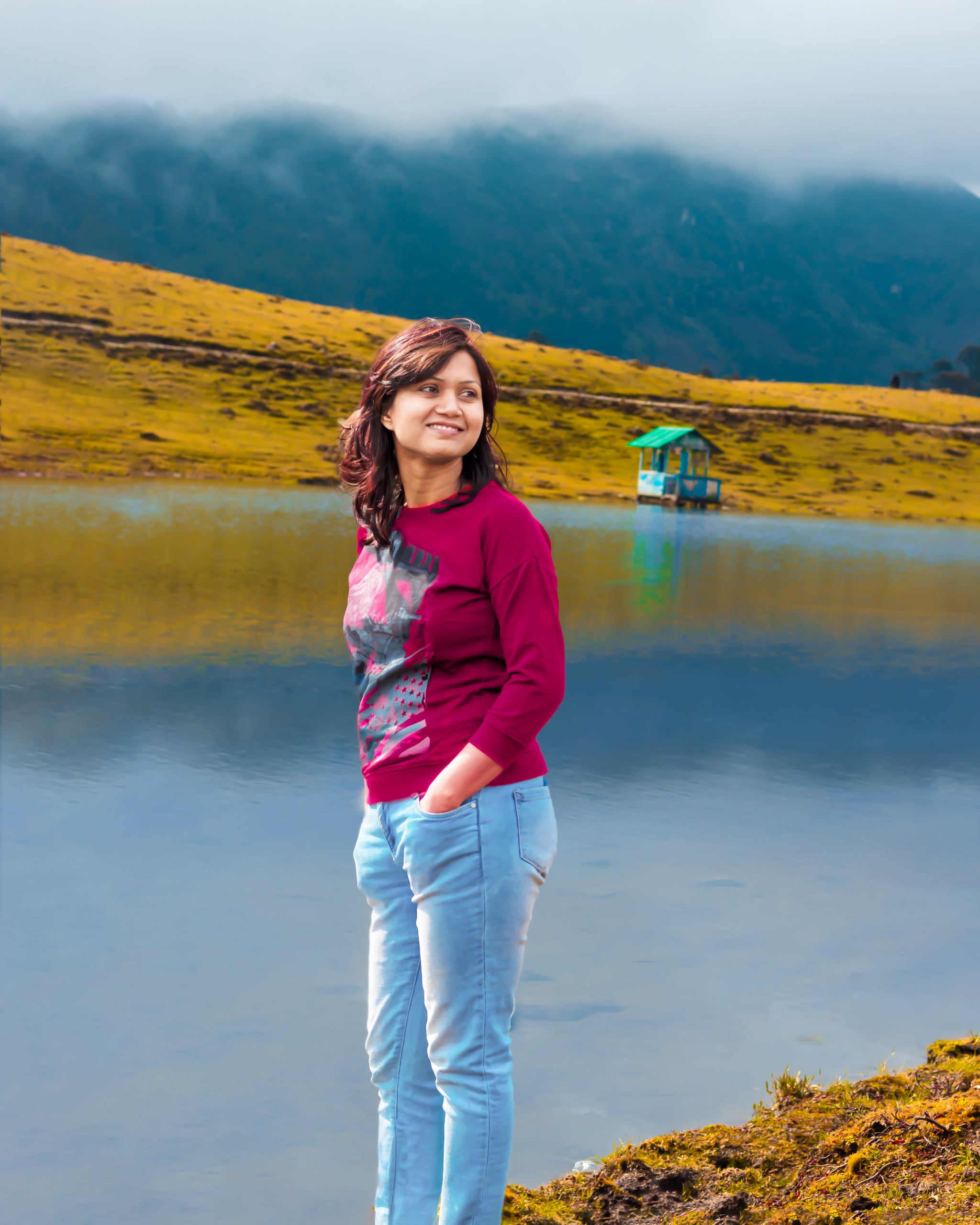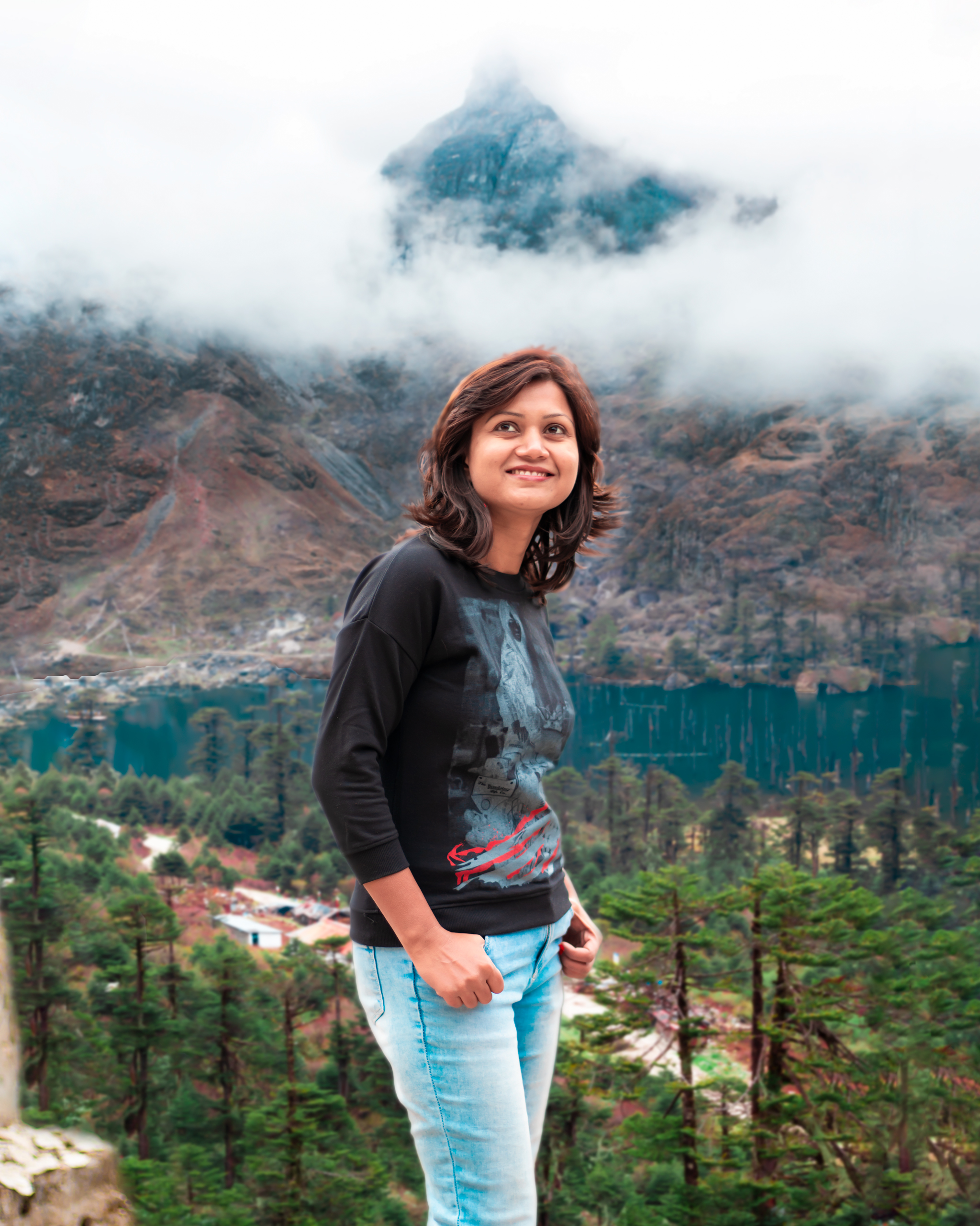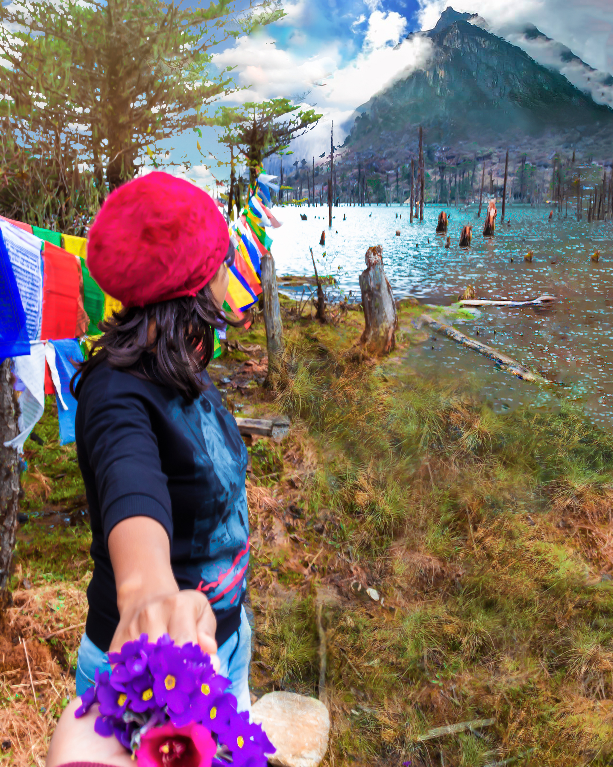 Sangetsar lake and its backdrop look completely different every two months. Purple & Blue Rhododendrons were covering the mountain base on the way to this lake, just to welcome me, cough! Plucked few for the photoshoot. According to what the locals have to say, initially the lake was approximately 1 km away from its current spot but during the earthquake, a shift in tectonic plate caused the move of the lake to its current location. It submerged a great part of a pine forest too and if you visit the beautiful lake, you will see tree trunks of pine tree pop out of the lake which makes it a unique, offbeat picturesque travel destination. Well, do you remember the song Tanhai Tanhai from ShahRukh and Madhuri Dixit starred Koyla?