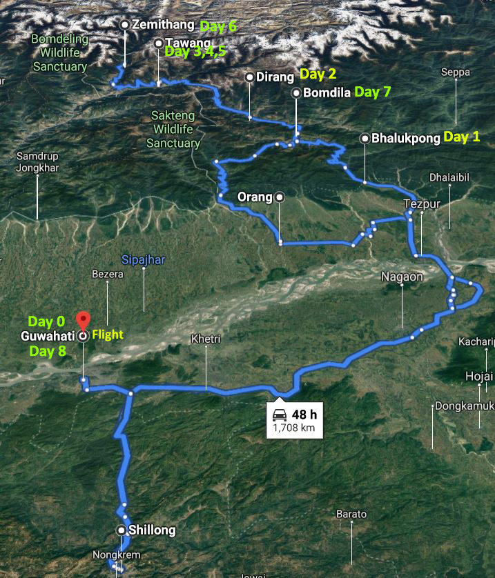 Guwahati-Tezpur(Transit)- Kalaktang-Orang- Dirang(Transit)-Tawang(Transit)-Bumla-Tawang-Zemithang-Tawang-Bomdila(Transit)-Rupa-Kalaktang-Orang-Guwahati(Transit).